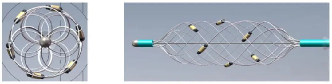 由网篮构成的网面可以提供足够的三维支撑力,螺旋状分布的6个电极将实现与血管内壁的良好贴合,确保了能量场的连续运行以实现稳定有效的“整体”消融。网篮在起始时处于回抱状态,在进入血管后通过体外手柄推钮使之主动扩张。