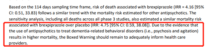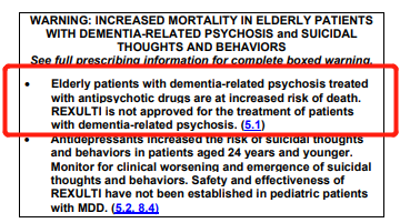 当年使得FDA做出这一决策的数据来源于对第二代抗精神病药物的临床分析,荟萃性分析显示:对17项安慰剂对照试验(持续时间为10周)中,药物治疗患者的死亡风险是安慰剂治疗患者的1.6至1.7倍。如阿立哌唑,利培酮,奥氮平等第二代抗精神病药中,均发现患者中风(致死性中风)或短暂性脑出血的事件更高。因此2015年REXULTl被批准用于治疗重度抑郁症和精神分裂症时,未被批准用于痴呆症相关精神病患者的治疗,且也被加了黑框警告。