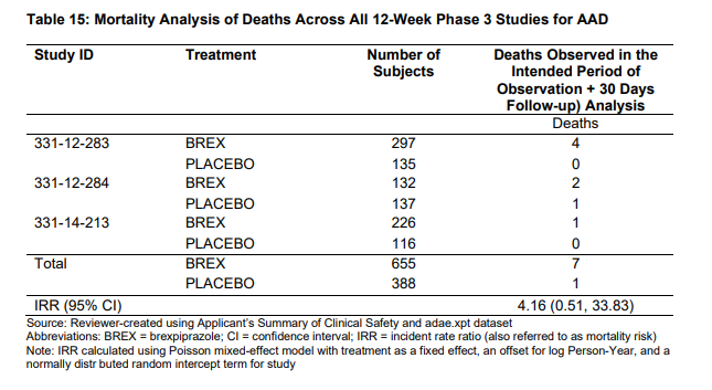 共同开发Rexulti的两家制药商——大冢制药和灵北制药当然想要摘掉这个黑框警告,同时拓展适应症,因此他们做了三项临床试验,数据被FDA的专家评价为相当充足,给人留下了非常深刻的印象,分析相当有说服力。