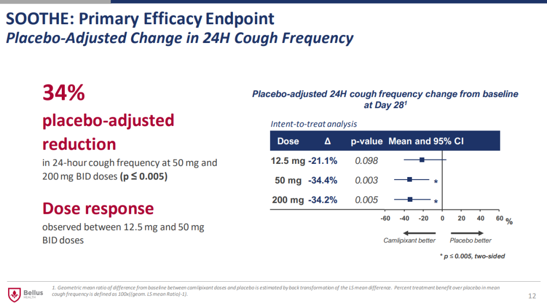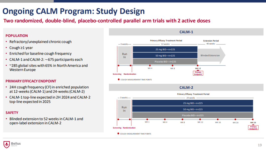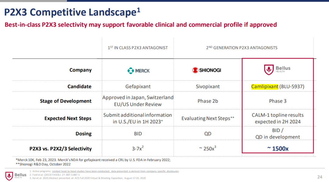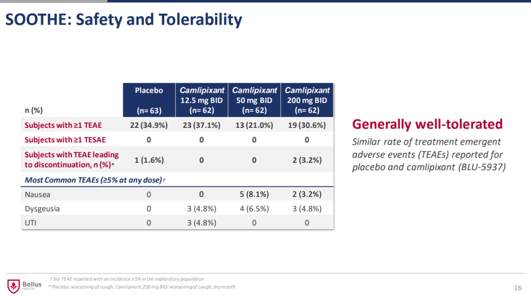 基于这些数据,BELLUS已启动两项camlipixant的注册性III期临床试验(CALM-1和CALM-2),并预计分别于2024年H2和2025年公布研究结果。此外,BELLUS还开发了camlipixant的每日一次口服制剂,目前该制剂处于I期研究阶段。
