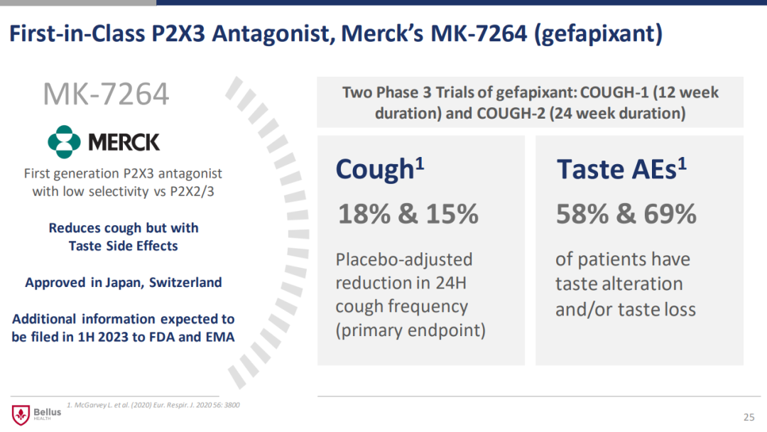 据估计,全球约2800万例慢性咳嗽患者,其中1000万例患者患有RCC长达一年。饱受RCC困扰的患者可能会导致抑郁症(53%)、尿失禁(~50%)、疼痛、肋骨骨折、社交回避和睡眠不足。gefapixant(默沙东/罗氏)是目前唯一一款获批用于治疗RCC的药物,不过仅在日本上市。