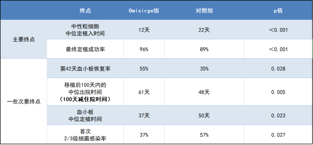 3、脐带血(UCB)。相较于外周血,脐带血要温和的多,对配型的要求也比较低。缺点在于,每个人的脐带血就那么点,干细胞含量很少,移植进体内之后要花比较长的时间重建免疫系统。由于移植前需要强化疗,把自身免疫系统先干碎,从破碎到重建的周期越长,术后感染风险越高。同时,用异体的UCB也会有一定的可能性引发GVHD。了解了这些问题之后,再看这次获批的Omisirge,就更能理解其意义。Omisirge的获批基于一项3期临床试验。由于Omisirge中HSC的来源是UCB,所以对照组是正常的UCB移植。主要终点设定为中性粒细胞定植所需时间,这是衡量重建免疫系统速度的重要指标。次要终点为移植100天内细菌感染、存活和出院的情况。试验共入组125名受试者,其中有17名最后未实现移植,1名转组,余下108名患者,52名接受Omisirge移植治疗,56名接受标准脐带血移植治疗。
