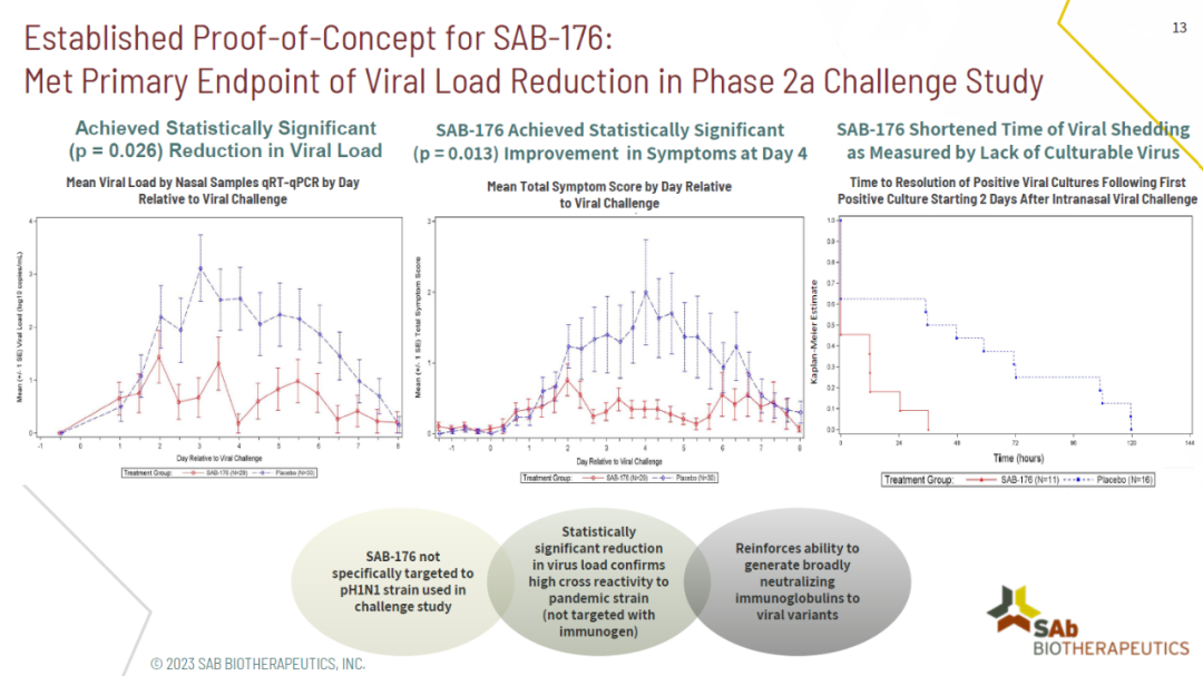 SAB Biotherapeutics公司的SAB-176是一款完全人源化的多克隆中和抗体,可以中和多种甲流和乙流病毒的突变株。在已经完成的2a期概念验证临床试验中,SAB-176在一次性治疗4天后,显著降低病毒载量并且改善患者症状。