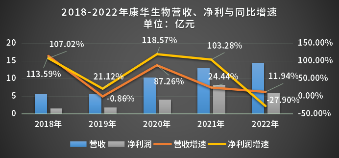 2022年年报显示,康华生物实现营业收入14.47亿元,同比增长11.94%;实现归母净利润5.98亿元,同比下降27.90%,是其自2020年上市以来净利润的首次下滑。