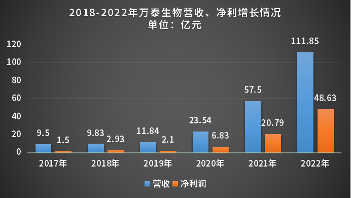 根据万泰生物2022年报内容显示,万泰生物期间实现营收111.85亿元,同比增长94.51%;净利润48.63亿元,同比增长133.9%,为医药产业中增速最快的企业之一。