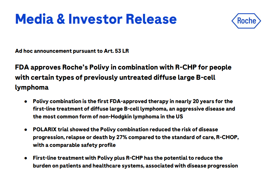4月19日,罗氏宣布维泊妥珠单抗(Polivy)获FDA批准用于联合R-CHP方案(利妥昔单抗+环磷酰胺+多柔比星+泼尼松)治疗未经治疗的弥漫性大B细胞淋巴瘤(DLBCL)患者。