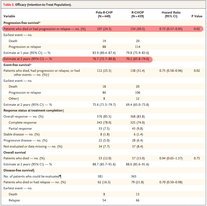 结果显示,与R-CHOP组相比,Polivy联合R-CHP组患者的PFS在统计学意义和临床意义上延长,可将患者的疾病进展、复发或死亡风险降低27%(HR=0.73;95%CI:0.57–0.95;p<0.02)。Polivy联合R-CHP组患者的2年PFS率为76.7%(95%CI:72.7–80.8),R-CHOP组这一比例为70.2%(95%CI:65.8-74.6)。