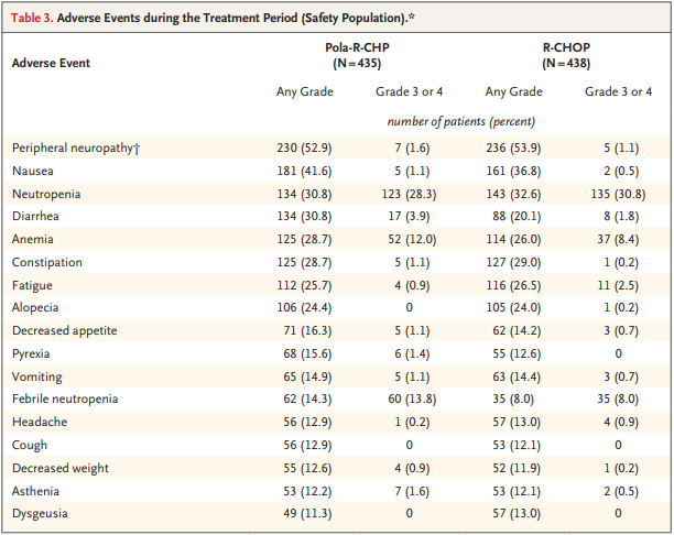 安全性方面,Polivy联合R-CHP与R-CHOP的总体安全性基本相似,未发现新的安全信号。最常见的3级或4级不良事件(AE)是中性粒细胞计数减少(28.3% vs 30.8%)、发热性中性粒细胞计数减少(13.8% vs 8.0%)和贫血(12.0% vs 8.4%)。此外,两组之间因中性粒细胞计数减少或感染而停用试验方案中至少一种药物(2.1% vs 2.3%)或减少剂量(1.8% vs 2.5%)的事件发生率相似。