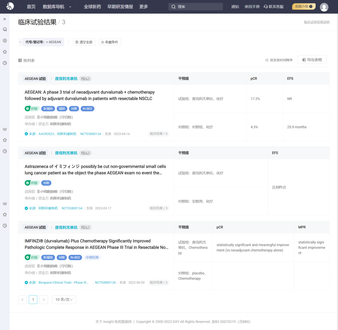 AEGEAN 研究是一项抗 PD-L1 抗体度伐利尤单抗新辅助/辅助治疗可切除(IIA、IIIB)的 NSCLC 的 3 期临床试验,目前取得了积极结果。作为全球首款 NSCLC 围手术期免疫治疗,在去年 6 月阿斯利康就宣布该研究中期结果积极,相较于对照组新辅助化疗,联合化疗方案显著改善了主要终点病理完全缓解(pCR),主要病理反应(MPR)的统计学也显著改善。今年 3 月,结果显示达到了无进展生存期(EFS)的主要终点。