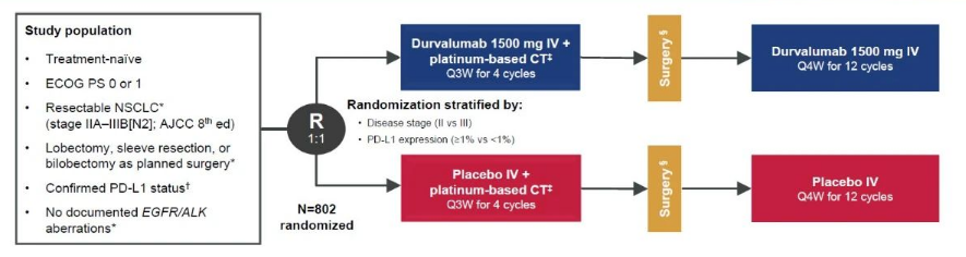 在 AEGEAN 研究中,802 位患者随机接受每三周一次的 1500 mg Imfinzi+含铂化疗或安慰剂+含铂化疗,持续 4 个周期,术后每 4 周接受 Imfinzi 或安慰剂治疗,每周给药一次(最多 12 个周期)。患者按疾病分期(II 期 vs III 期)和 PD-L1 表达水平(<1% vs ≥ 1%,Ventana SP263)。EGFR/ALK 异常的患者被排除在改良意向治疗 (mITT) 人群之外。