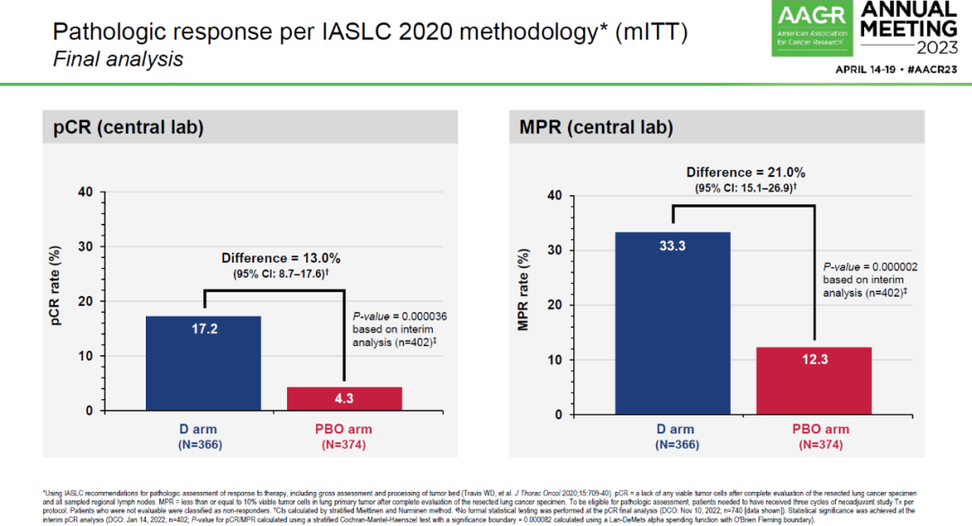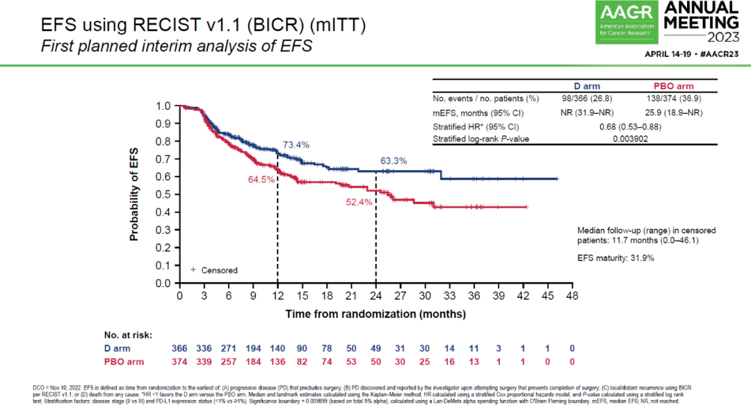 截至 2022 年 11 月 10 日,中位 EFS 随访时间为 11.7 个月(mITT),D 组与 PBO 组(mITT)的 pCR 率显著提升,EFS 显著延长。安全性方面,D 组和 PBO 组的最大 3/4 级全因 AE 发生率分别为 42.3% 和 43.4%。