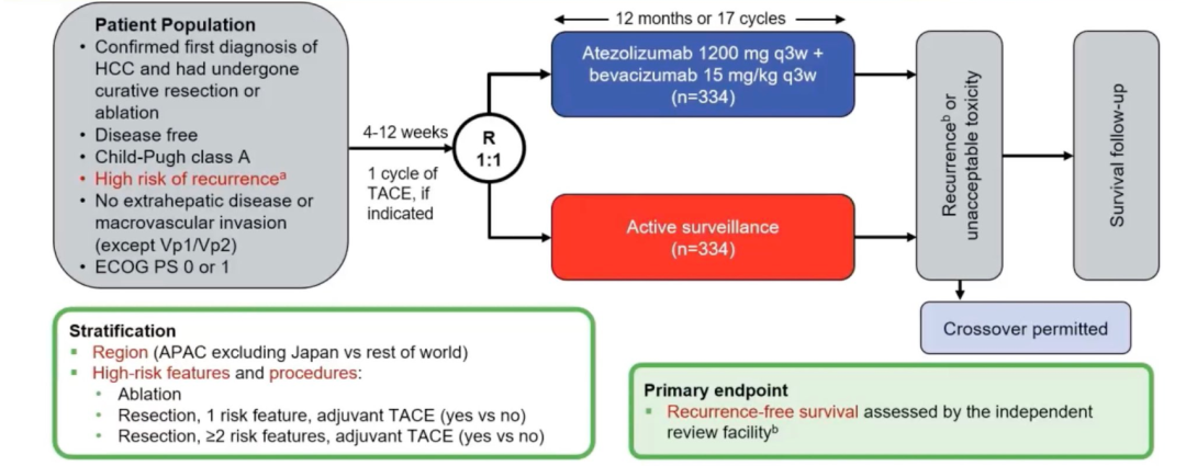 分层因素包括:地域(除日本以外的亚太地区 vs. 全球其他地区)以及综合性因素(涵盖高风险特征数量、治疗方法、选择性辅助 TACE)。A 组患者接受阿替利珠单抗 1200 mg+贝伐珠单抗 15 mg/kg IV q3w 治疗 1 年或 17 个周期;B 组患者接受 1 年主动监测,并在独立评审机构(IRF)确认复发后允许交叉至 atezo + bev 组治疗。