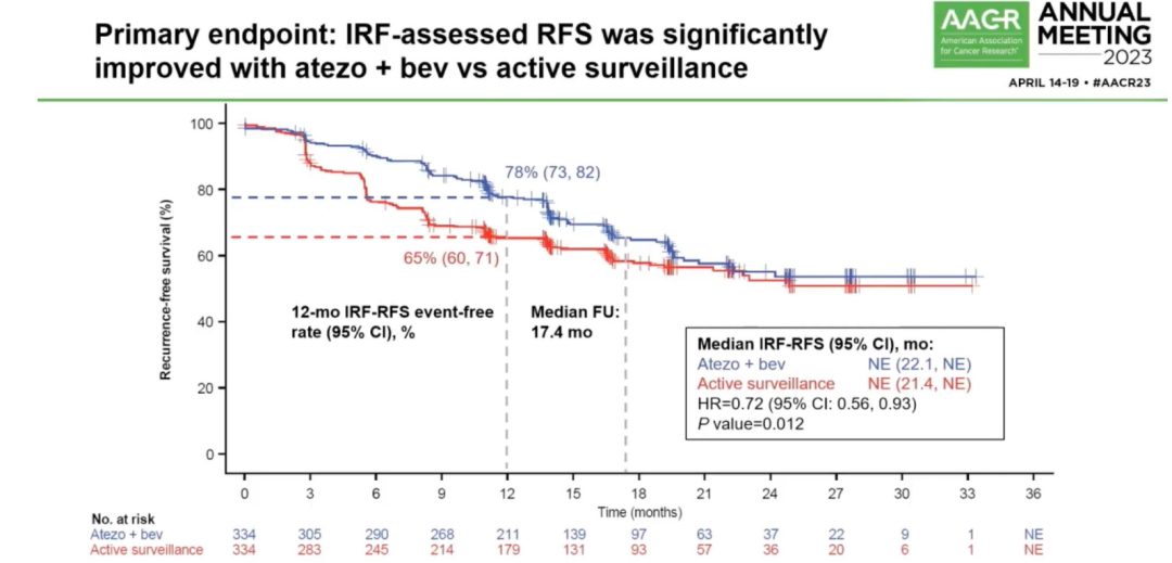 本次中期结果显示中位随访时间为 17.4 个月(截止日期:2022 年 10 月 21 日),主要终点 IRF-RFS HR 为 0.72(95% CI,0.56~0.93;P = 0.0120),结果在临床亚组中基本一致。INV-RFS 与之类似(HR 为 0.70;95% CI,0.54~0.91;P = 0.007),且 A 组疾病复发风险较 B 组降低 33%。atezo + bev 的安全性整体可控,与每种治疗药物和潜在疾病的既往安全性一致。
