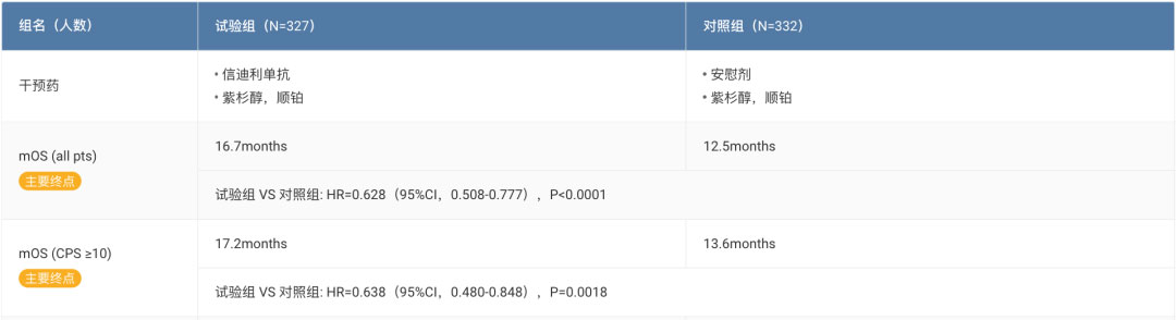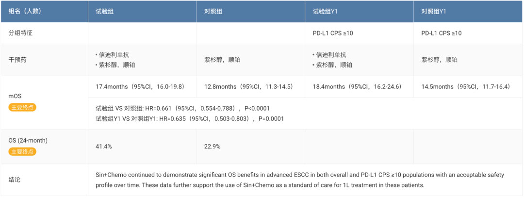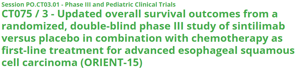 ORIENT-15 研究(登记号:NCT03748134)评估了信迪利单抗联合化疗(紫杉醇,顺铂)与安慰剂联合化疗作为不可切除的局部晚期、复发或转移性食管鳞状细胞癌。在预先指定的中期分析中,这项研究达到了所有患者的 OS 的主要终点。