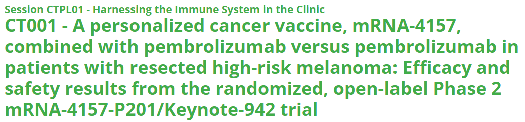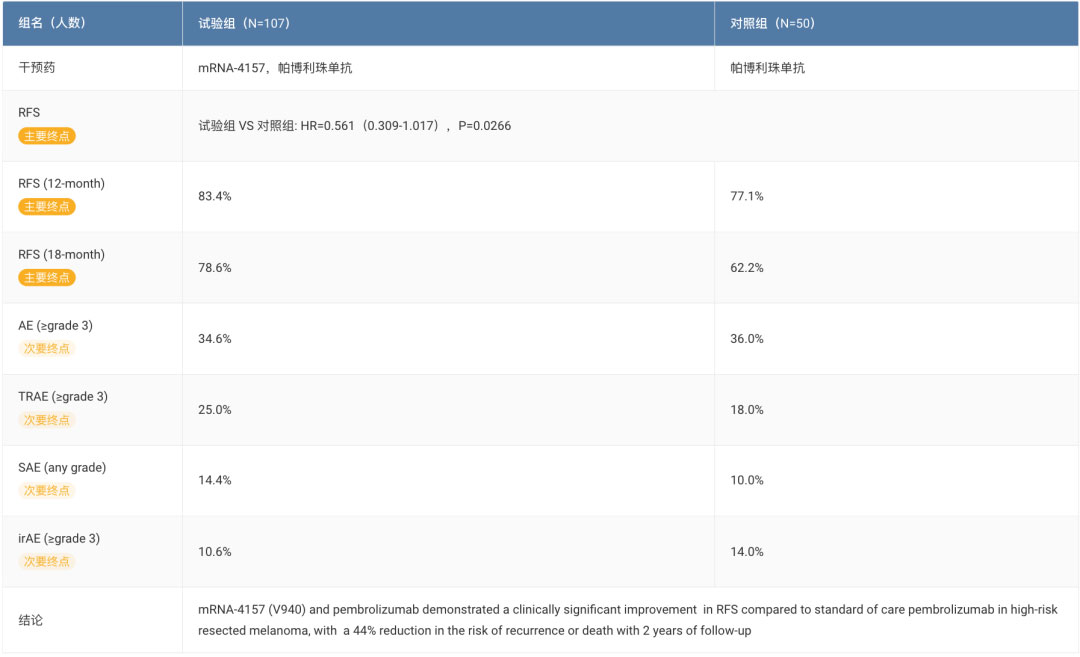 与帕博利珠单抗相比,mRNA-4157 联合帕博利珠单抗作为辅助治疗切除的高危黑色素瘤显着延长了 RFS,而没有增加具有临床意义的不良事件。这些结果首次证明在切除的高危黑色素瘤中 RFS 优于辅助护理标准 PD-1 阻断,并提供了第一个随机证据表明个性化新抗原方法可能对癌症患者有益。