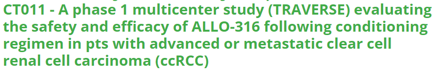 ALLO-316 已获得 FDA 授予的快速通道认定(FTD),治疗标准治疗失败的晚期/转移性肾透明细胞癌。本次大会展示了晚期或转移性肾透明细胞癌(ccRCC)患者在预处理方案后接受 ALLO-316 治疗的安全性和有效性结果。
