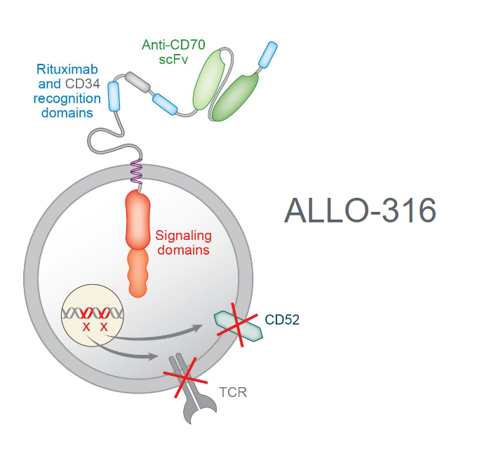 ALLO-316 是 Allogene Therapeutics 公司开发的一款靶向 CD70 的同种异体 CAR-T 产品(AlloCAR T™)。CD70 是一种 II 型跨膜糖蛋白,被证明在多种恶性肿瘤中高度表达,包括 RCC、胶质母细胞瘤及 AML 等。肿瘤细胞通过表达 CD70 结合 T 细胞受体 CD27,慢性共刺激导致 T 细胞表达 PD-1,TIM-3 等免疫检查点,从而导致免疫功能耗竭。