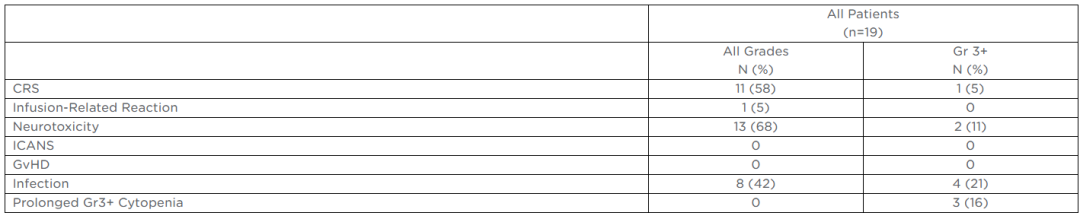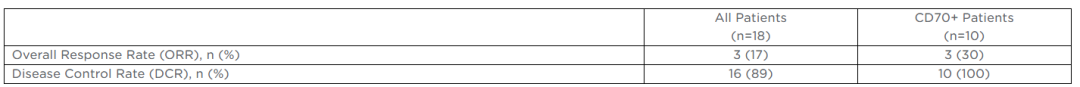 该研究初步疗效数据显示,截止 2023 年 3 月 23 日,在总体人群中,ORR 为 17%(3/18),疾病控制率为 89%(16/18)。在 10 名 CD70+ RCC 的患者中,ORR 为 30%,DCR 为 100%。安全性方面,65% 经历了 CRS,除 1 例 Gr3 外,其他均为低级别。没有观察到 ICANS 或 GVHD。1 例 DLT(升高的 LFT)并且需要剂量扩展。