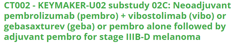 今年 3 月 16 日,默沙东公布了 PD-1+TIGIT 复方制剂 MK-7684A 治疗转移性非小细胞肺癌(NSCLC)的非注册 II 期 KEYVIBE-002 研究失败,未达到 PFS 统计学意义改善的主要终点,且疗效不如多西他赛。而本次 AACR 大会公布了 1/2 期 KEYMAKER-U02 的子研究 02C 部分结果。该部分试验旨在评估 Pembro 联合抗 TIGIT 抗体 Vibostolimab 或联合溶瘤病毒产品 gebasaxturev 或单独 Pembro 用于新辅助治疗 IIIB-D 期黑色素瘤的安全性和有效性。