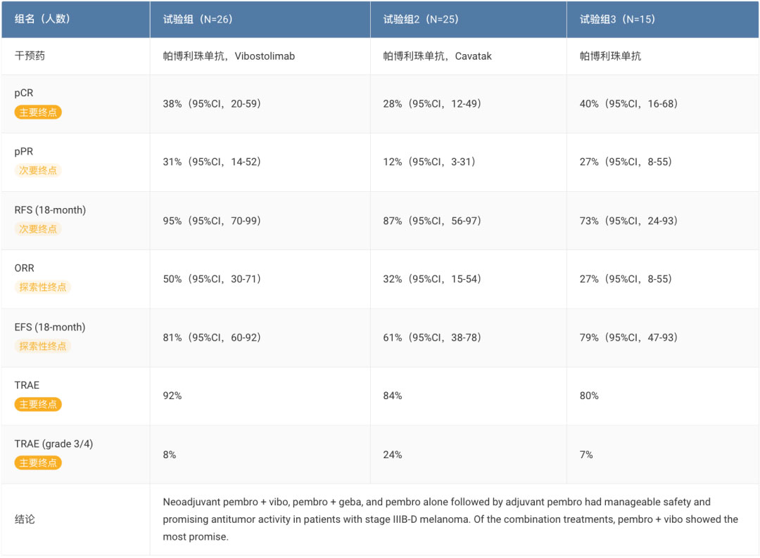 该研究共纳入可切除 IIIB-D 期黑色素瘤患者 66 例,随机分配到研究组中,切除前,试验组 1,Pembro(200 mg Q3W)+vibo(200 mg Q3W)治疗(n = 22);研究组 2,Pembro(400 mg)+geba(n = 25);研究组 3,Pembro(400 mg)(n = 15)。治疗 6 周后进行手术切除,在第 12 周 Pembro 辅助治疗,间隔给药(400 mg,Q6W),给药次数 ≤ 8 次(整体治疗时间约 1 年)。主要终点为安全性和耐受性以及 pCR(INV)。