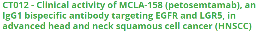这是一项 1/2 期开放标签、多中心、国际多中心研究(登记号:NCT03526835),其中初始剂量递增部分用于确定 MCLA-158 单药在 mCRC 患者中的 RP2D。目前剂量递增部分已经完成,RP2D 将在研究的扩展部分进一步评估有 EGFR 依赖性和对 EGFR 抑制的潜在敏感性证据的选定实体瘤适应症的队列。此次 AACR 会议公布了在晚期头颈部鳞状细胞癌 (HNSCC) 中的临床活性。