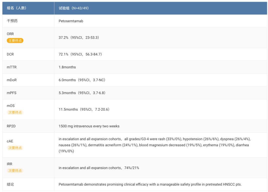 在先前接受过铂类化疗和检查点抑制剂治疗的 HNSCC 患者中观察到有希望的活性。截至 2023 年 02 月 01 日,49 名 HNSCC 患者接受了治疗。患者接受过中位数为 2 线(1-4)的既往全身治疗。在 43 名可评估疗效的患者中,每位研究者的 ORR 为 37.2%,DCR 为 72.1%,mDOR 为 6.0 个月。中位 PFS 为 5.3 个月。