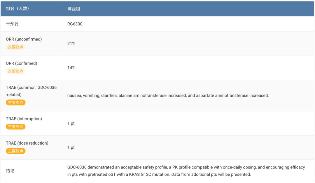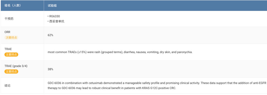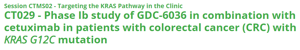 在正在进行的 I 期研究(登记号:NCT04449874)中,晚期或转移性 KRAS G12C 阳性 CRC 患者接受 GDC-6036(每天一次口服 200-400 mg)和西妥昔单抗(最初静脉注射 400 mg/m2,然后静脉注射 250 mg/ m2 每周)直到无法耐受的毒性或疾病进展。终点包括安全性、PK、和初步抗肿瘤活性。