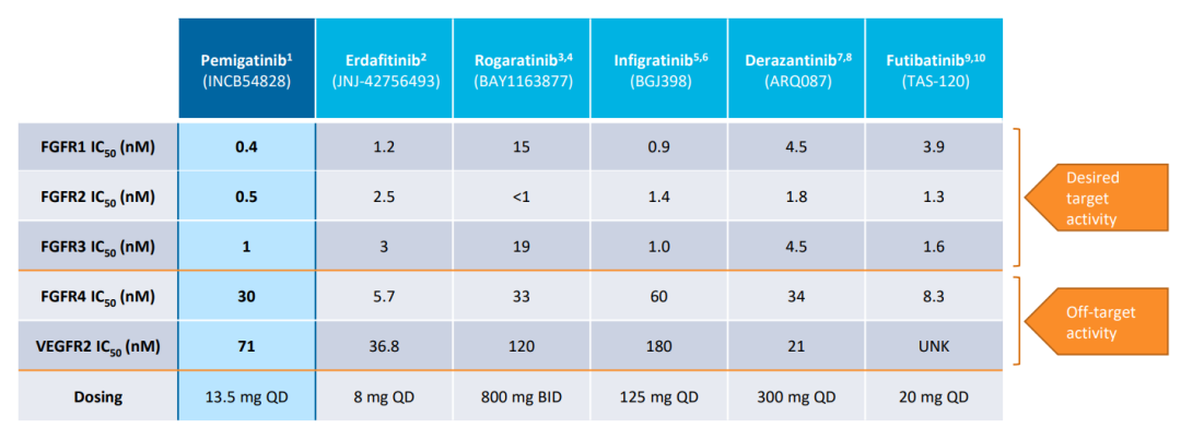 佩米替尼 (Pemigatinib)是 Incyte 原研的 FGFR1、2、3 的选择性口服小分子抑制剂,成纤维细胞生长因子受体 ( FGFR ) 是多种癌种的潜力靶点。