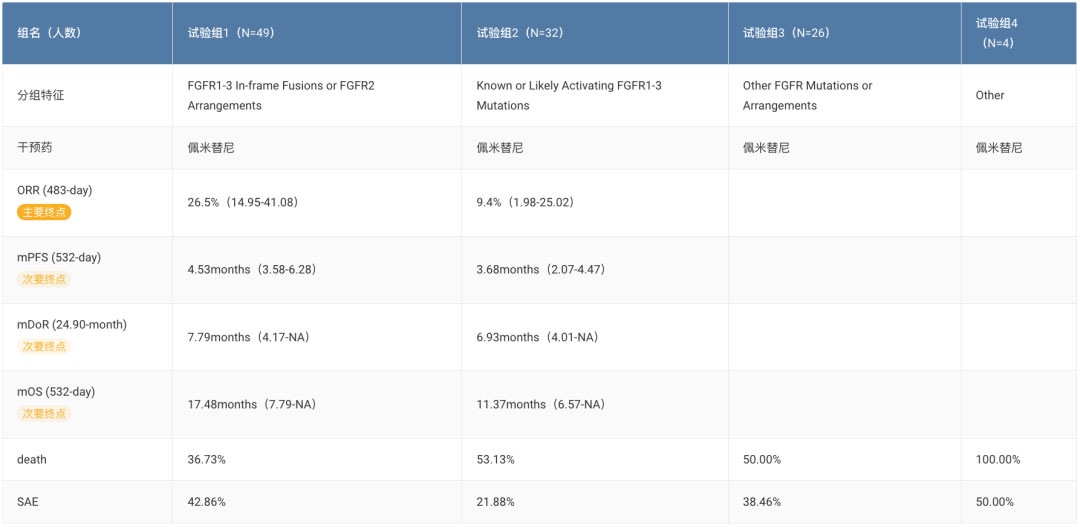 在该项研究中,患者被分配到队列 A(FGFR1-3 融合)、B(FGFR1-3 激活非激酶结构域突变)和 C(FGFR1-3 激酶结构域突变和未知意义的改变)并每天一次连续接受 13.5 mg pemigatinib。禁止先前的 FGFR 抑制剂治疗。主要终点为 ORR。
