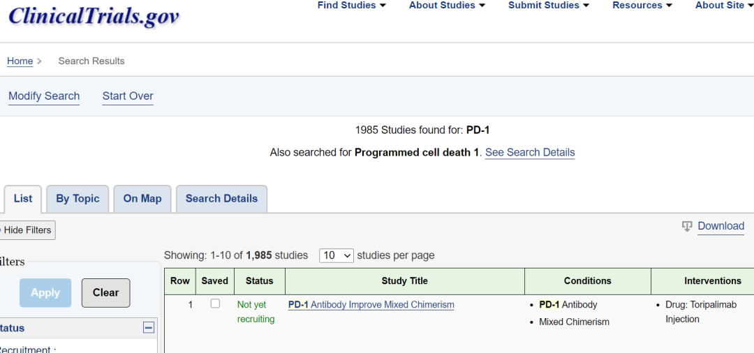 截至2023年04月20日,笔者在ClinicalTrials.gov网站搜索PD-1词条,共出现1985项研究,其中Recruiting为712项,而相比于最卷的2020~2021年已经少了近一半的临床研究。