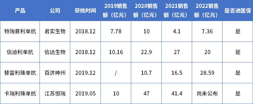 目前,我国获批PD-1单抗有11款,其中OPDIVO与Keytruda两款为进口,其余9款产品为国产,国内最早获批的公司分别为君实生物、信达生物、百济神州以及江苏恒瑞,被称为国产“PD-1四小龙”。下表1为君实生物、信达生物、百济神州以及江苏恒瑞产品的上市信息及近年销售额情况。