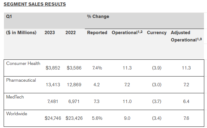 4 月 18 日,强生发布了 2023Q1 业绩情况。在这一季度强生销售额增长 5.6% 至 247 亿美元,其中制药部门收入 134.13 亿美元,同比增长 4.2%。