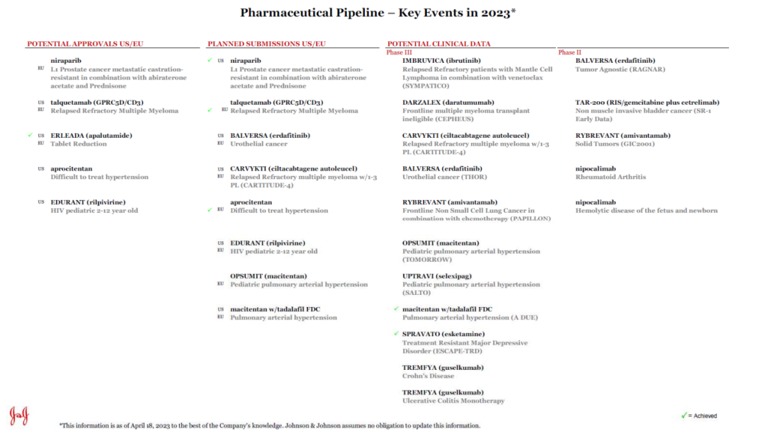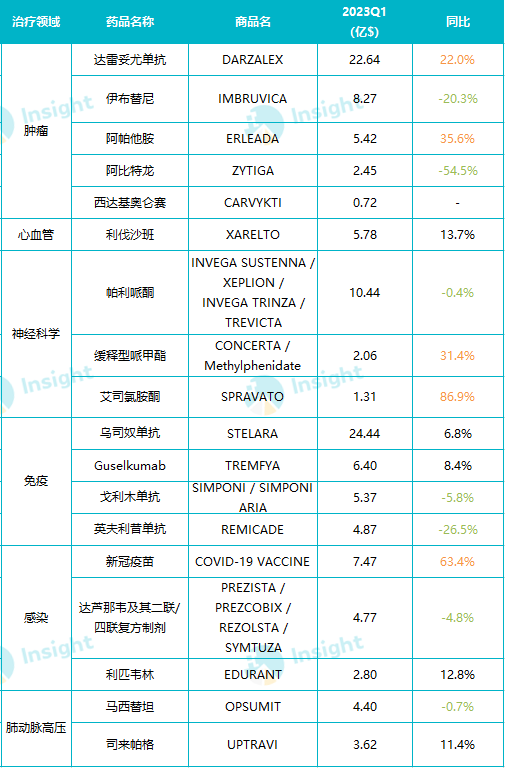 从制药部门来看,收入的增长主要依赖于达雷妥尤单抗(DARZALEX)、乌司奴单抗(STELARA)、阿帕他胺(ERLEADA)、西达基奥仑赛(CARVYKTI)和利伐他班(XARELTO)这几款重点产品驱动;部分受到英夫利西单抗(REMICADE)、伊布替尼(IMBRUVICA)和阿比特龙(ZYTIGA)销售额下降所抵消。