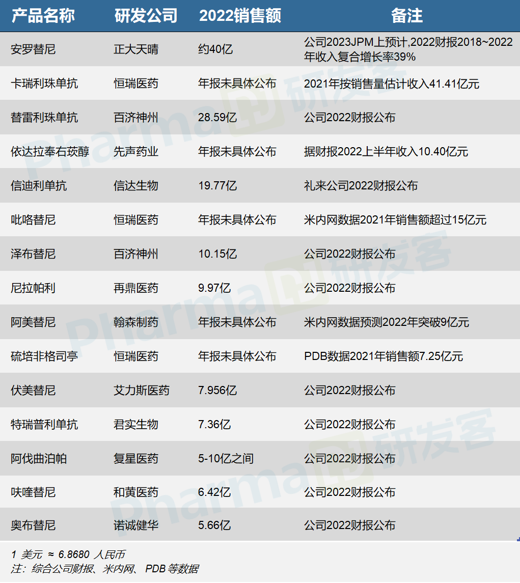 复星医药的阿伐曲泊帕,米内网数据显示其2021年中国三大终端6大市场的规模超过3.5亿元,同比增长超过2000%,这是其获得医保报销的首个年度,另外2022年财报提及销售收入已进入5~10亿区间。