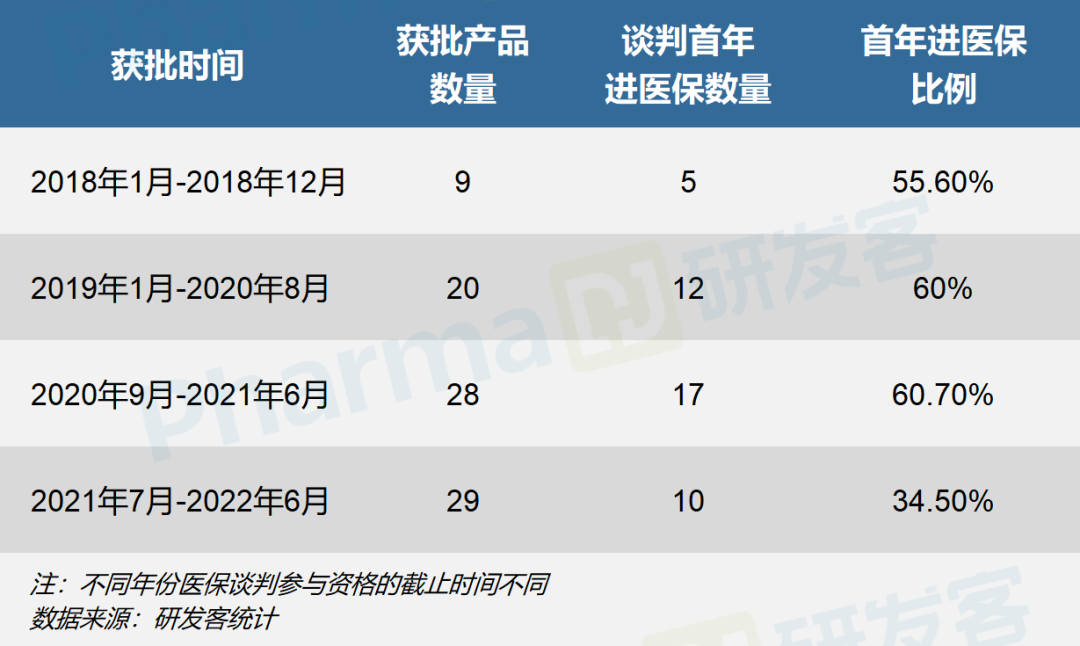 事实上,国产创新药在具备谈判资格首年即纳入医保的比例,在多年保持60%左右的高位后,于去年开始明显下降(见下表统计)。研发客同时发现,理性看待创新药进医保,是更多企业在采访中表达出的声音,它们并非排斥医保,而是希望在做决定时全面斟酌。