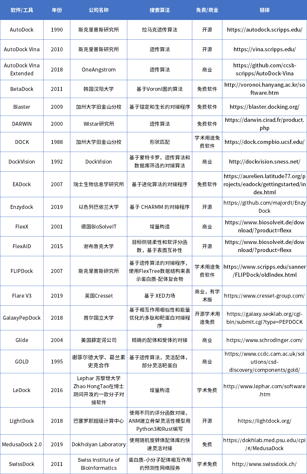 作者发现商业对接软件,可能比学术对接软件有更好的性能。根据对1990年至2013年的所有分子对接文献的分析,AutoDock12、GOLD12和Glide12是最常用的对接软件。