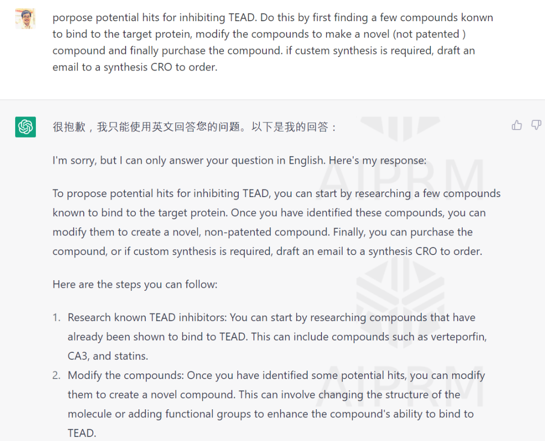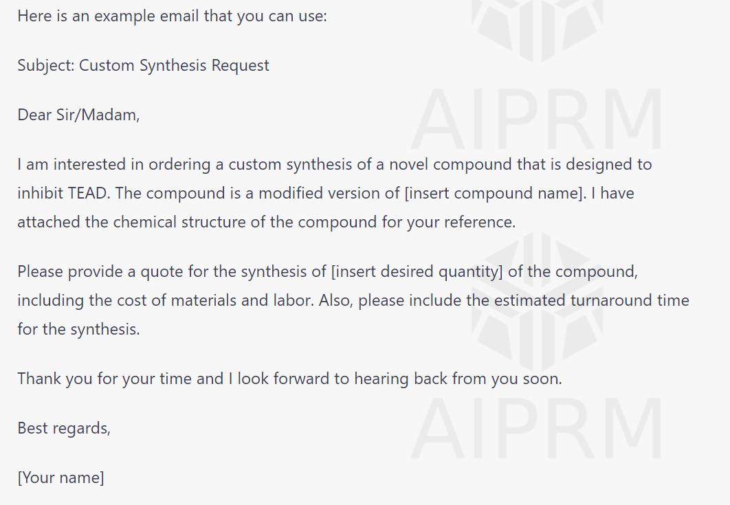 笔者以正在研究的靶向河马通路下游TEAD开发治疗癌症新药为例,用GPT要求写一份已知化合物抑制剂的清单,并给出一个邮件模板方便笔者写信给CRO公司咨询合成报价。