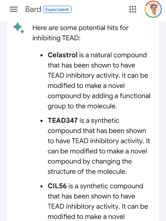 相比ChatGPT找到了CA3(CIL56)化合物,BARD提出了更多候选化合物,包括共价抑制剂TEAD347等。