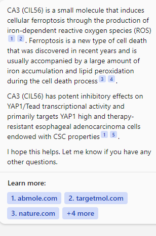通过Bing浏览器Edge dev版内置的Chat继续提问了解到CA3(CIL56)是一种小分子化合物,通过产生依赖铁的活性氧(ROS)诱导细胞铁死亡12。铁死亡是近年来发现的一种新型细胞死亡方式,通常在细胞死亡过程中伴随着大量铁积累和脂质过氧化反应。CA3(CIL56)对YAP1/Tead转录活性具有强烈的抑制作用,主要靶向具有CSC特性的YAP1高表达和治疗耐药性的食管腺癌细胞。