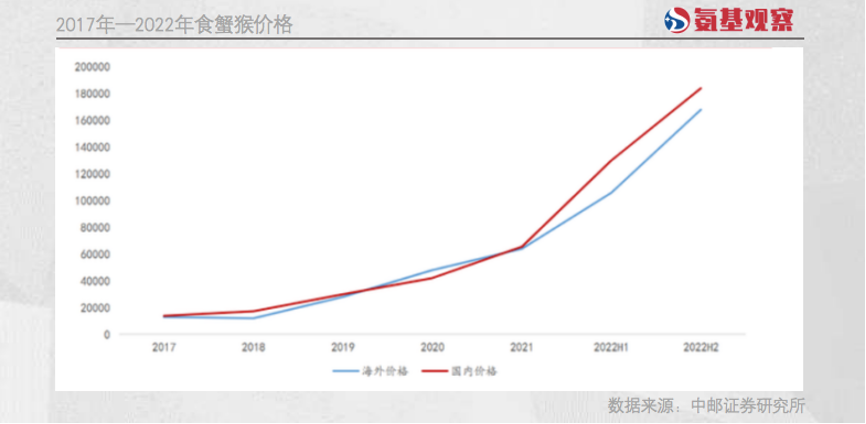 食蟹猴也在降。去年6月份,中国食品药品检定研究院发布招标公告,50只食蟹猴的招标价就达到970万元,均价达19.4万元/只;