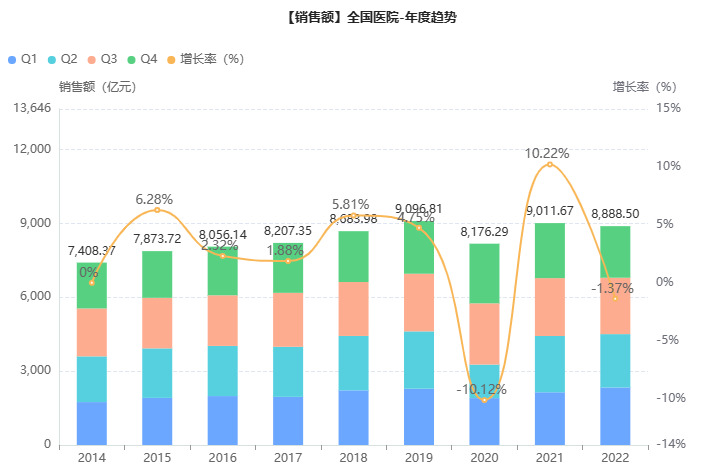据药融云数据库显示,2022年全年,全国院内销售市场规模为8889亿元,与2021年相比略有下滑。排名前10的药品共计占到总市场份额的8.4%,主要集中在系统用抗感染药及血液和造血系统用药领域。