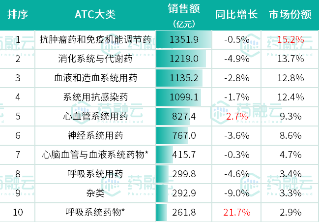 2022年院内销售额TOP10品类(标*为中成药品类)