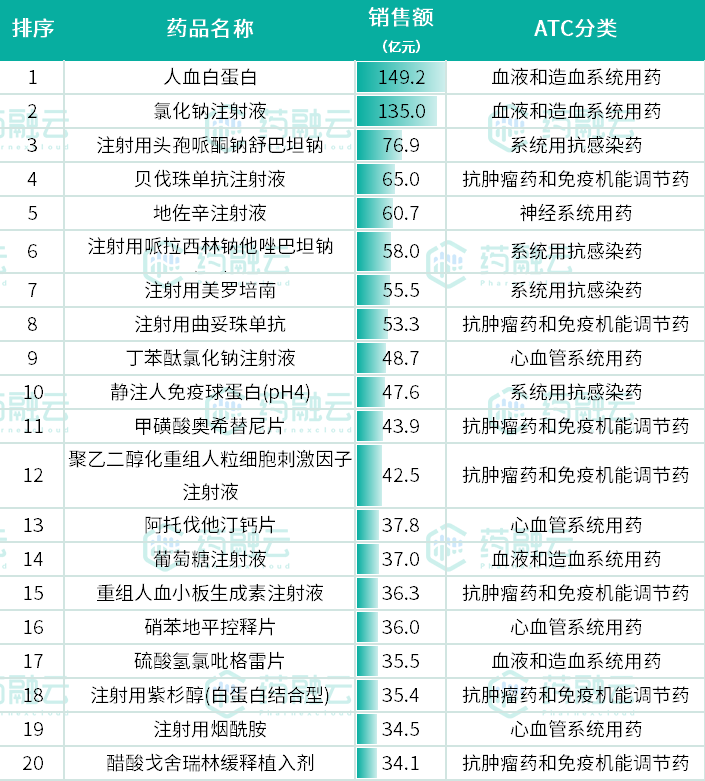 排名前10的产品共计占到总市场份额的8.4%,包括4款系统用抗感染药(注射用头孢哌酮钠舒巴坦钠、注射用哌拉西林钠他唑巴坦钠(8:1)、注射用美罗培南和静注人免疫球蛋白(pH4))、2款抗肿瘤药和免疫机能调节药(贝伐珠单抗注射液、注射用曲妥珠单抗)、2款血液和造血系统用药(人血白蛋白、氯化钠注射液),还有1款神经系统用药地佐辛注射液和1款心血管系统用药丁苯酞氯化钠注射液。