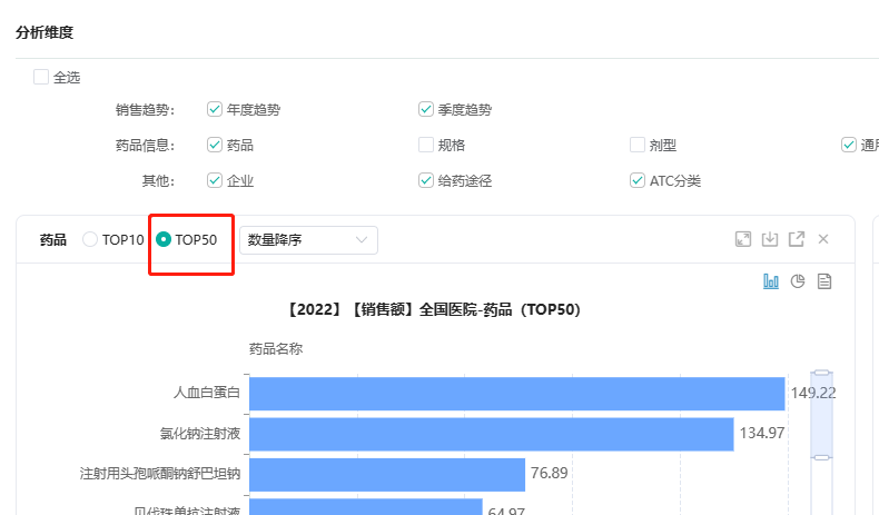 药融云全国医院销售数据库“全局分析”界面至多可显示TOP50药品,有需要的用户可移步官网查看,或在公众号后台回复关键词“药品50”获取名单表格。