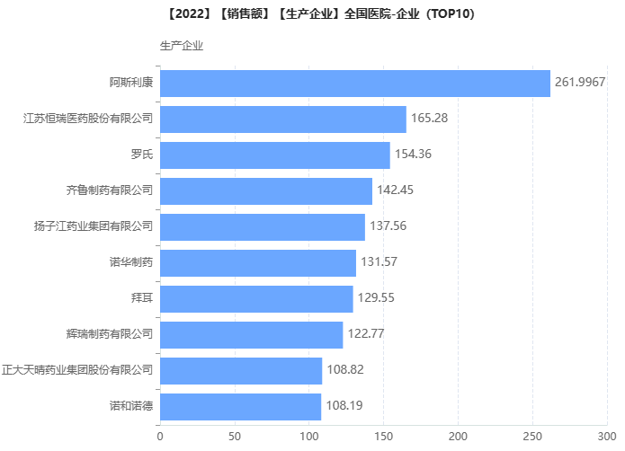 从生产企业来看,据药融云全国医院销售数据库【全局分析】显示,阿斯利康高居2022年院内销售TOP1企业,其次为江苏恒瑞。
