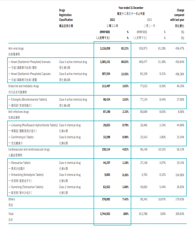 报告期内,核心产品抗流感药物磷酸奥司他韦颗粒及胶囊剂型累计销售额30.92亿元,同比增长超过450%;高血压药欧美宁、奥美沙坦酯销售销售收入分别为6292.2万和4425.7万元,同比分别增长26.65%和19.14%;痛风治疗药尔同舒销售收入9842.4万元,同比增长27.6%。