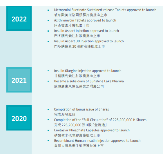 2022年,东阳光药有4个产品获国家药监局批准上市,分别是琥珀酸美托洛尔缓释片、阿奇霉素片、门冬胰岛素注射液、门冬胰岛素30注射液。