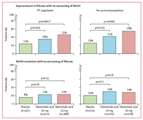 奥贝胆酸是全球首款在III期临床中取得积极结果的NASH药物。2019年2月,Intercept宣布奥贝胆酸用于治疗伴有肝纤维化NASH患者的为期18个月的REGENERATE研究中期分析取得积极结果[4]。本次中期分析共纳入了931名伴有2级或3级肝纤维化(F2~F3)的NASH患者,按1:1:1比例分成三组,分别接受每日一次奥贝胆酸10mg,25mg或安慰剂治疗。该研究的主要终点为纤维化改善≥1级且NASH无恶化的患者比例。结果表明,在治疗18个月时,奥贝胆酸高剂量组中23%的患者实现了纤维化改善≥1级且NASH无恶化,而安慰剂组仅有12%的患者达到这一指标(p=0.0002)。
