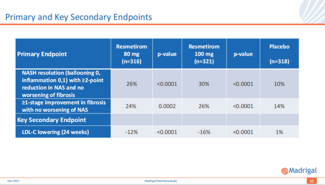 2022年12月19日,Madrigal宣布从其罗氏引进的THR-β激动剂Resmetirom用于治疗NASH的III期MAESTRO-NASH研究达到了双重主要终点。该研究共入组了966例患者,按1:1:1分为三组,分别接受Resmetirom 80mg、100mg或安慰剂治疗。主要终点是治疗52周肝穿的组织学结果,关键次要终点为治疗24周时LDL-C降低水平。