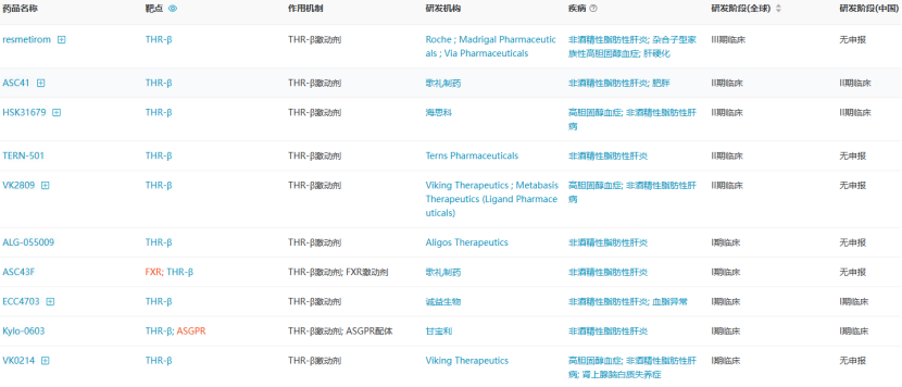在研THR-β激活剂 (图片来源:医药魔方NextPharma数据库)